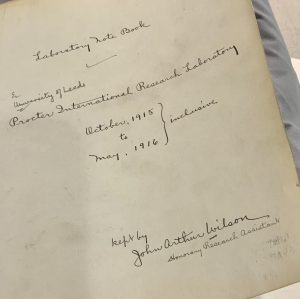 His dedication to research hit me strongly when I returned to Leeds and the University Archivist carried out a big grey cushion with a large notebook sitting on it. This was Wilson’s laboratory notebook, written entirely in his own hand, and whose 381 pages detailed his research work in 1915 and through into 1916. Leather Science might no longer be taught at Leeds, the old leather buildings might have been demolished but I still felt I was sitting in the room with John Arthur Wilson. He was there in his double-breasted suit and colourful tie explaining the effect of various acids on chrome tanned leather he had cut neatly into 8 square inch pieces.