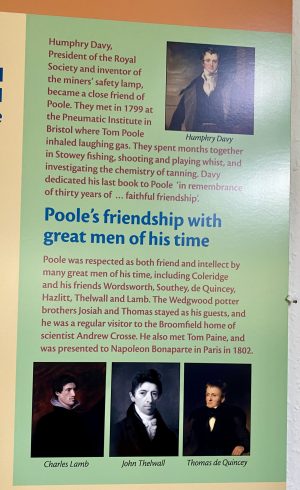 The 2nd of what we hope will be an annual lecture in memory of the Somerset Tanner, Tom Poole, from Nether Stowey. He lived from 1765 to 1837 bridging the period when modern scientific understanding was entering society, and with it the leather industry. Sir Humphry Davy, famed for nitrous oxide and the miner’s lamp, won the leading scientific prize – the Copley Medal – for his studies and lectures on leather a subject he had been discussing with Poole for years. Through Davy’s workplace in Bristol Poole became a part of a small community of friends such as Coleridge, Wordsworth and Tom Wedgwood. Professor Tom Fulford’s wonderful lecture took us through these complex relationships and how the rich liked to travel in Europe and experience the mountain air. His detailed research of the correspondence between Poole and Wedgwood and others gave us extraordinary insights .